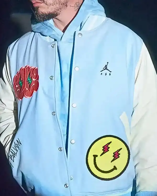 Shop Jordan J Balvin Blue And Off-white Wool Varsity Jacket Sale