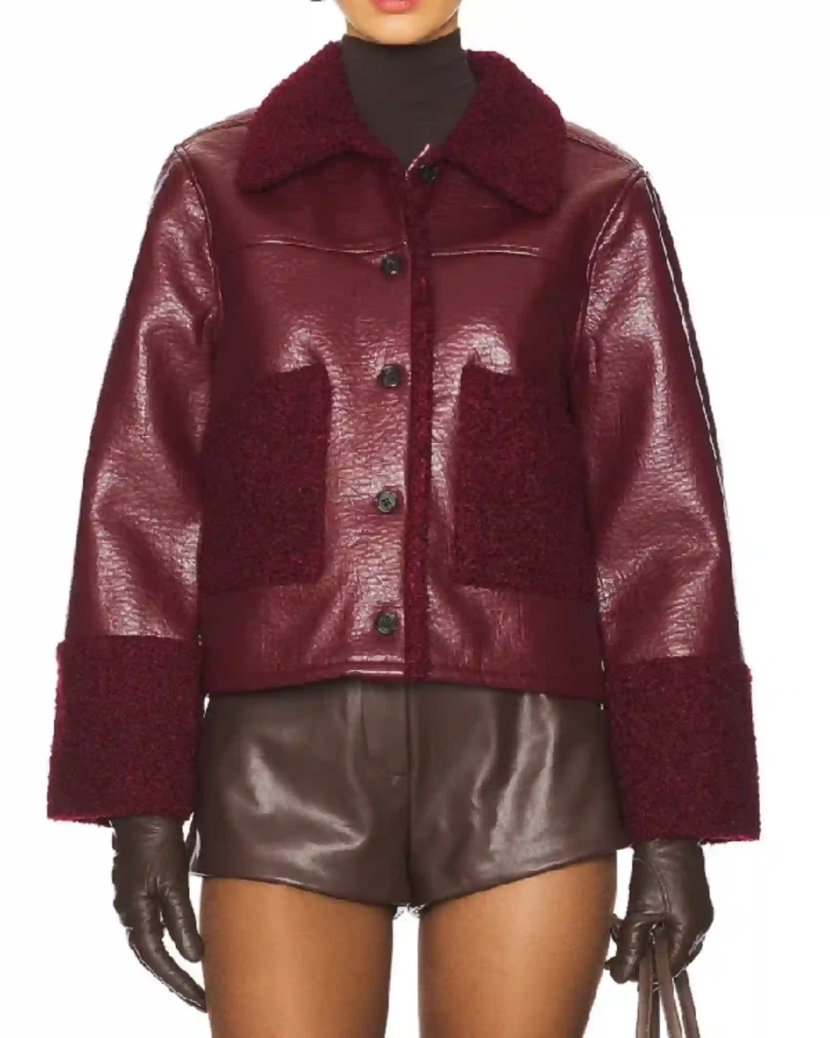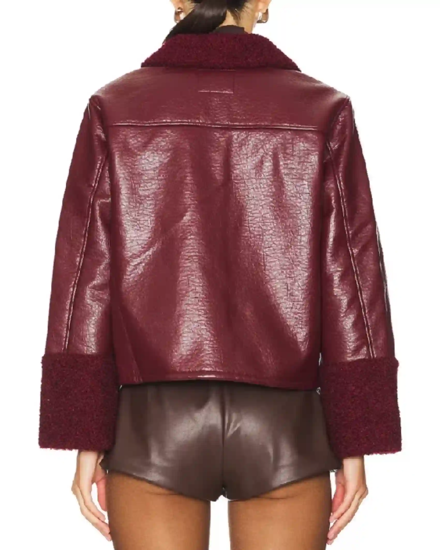 Beyond The Gates 2025 Eva Thomas Faux Shearling Collar, Cuffs &Burgundy Leather Shearing Cropped Jacket