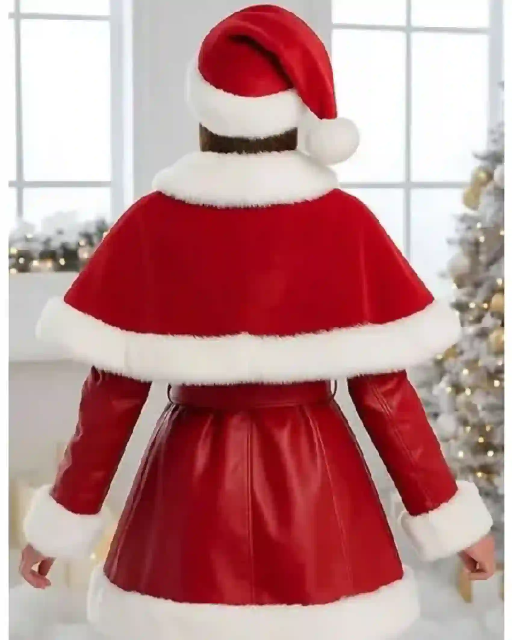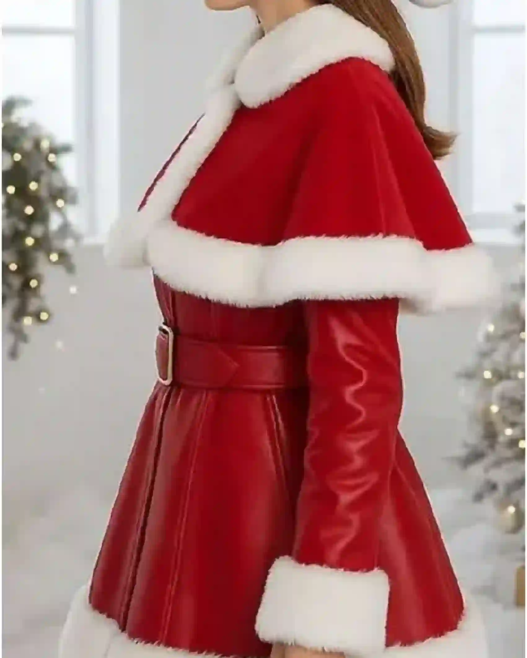 Buy Christmas Red Leather Shearling Coat with Detachable Cape for Women Sale