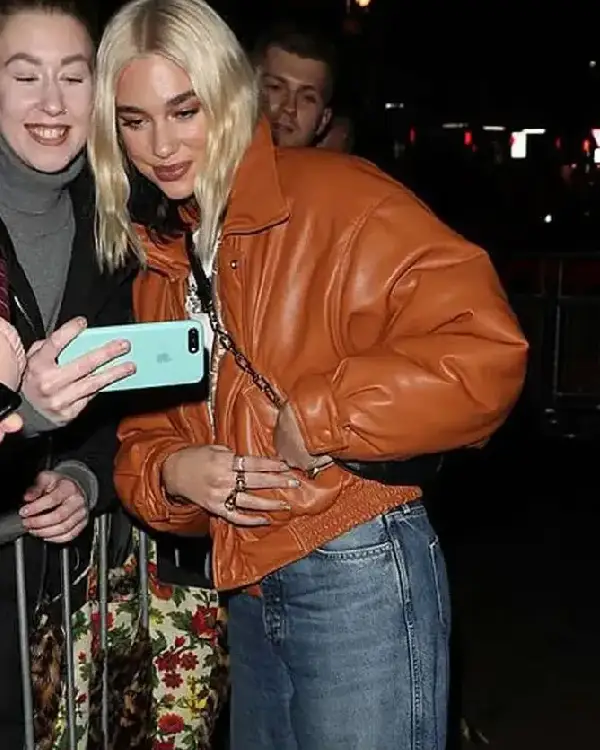 Shop Explore the Dua Lipa BBC Radio 1 Studios Brown Leather Jacket Bold Streetwear Style Sale