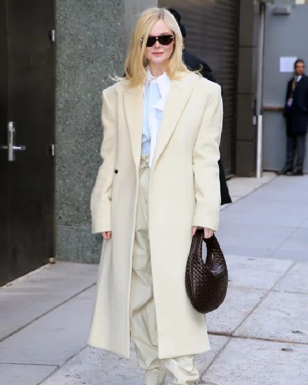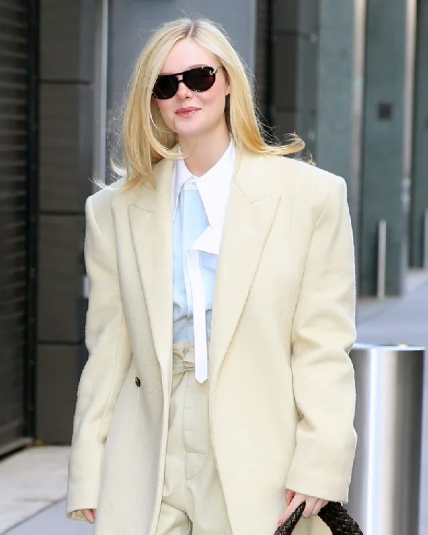 Buy Elle Fanning Good Morning America Studio In New York City Film Predator Badlands long Cream Overcoat