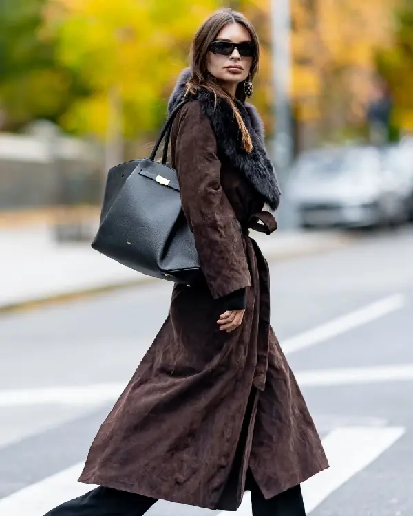 Buy Emily Ratajkowski New York City Long Dark Brown Suede Coat With A Black Fur Collar
