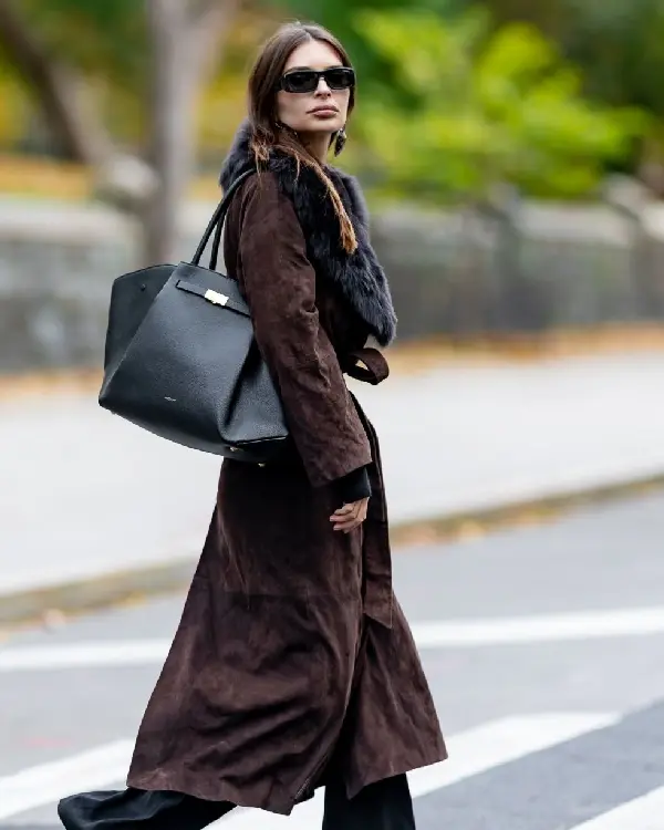 Emily Ratajkowski Long Brown Suede Coat With A Fur Collar