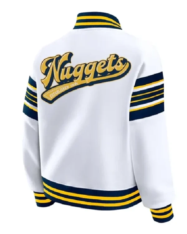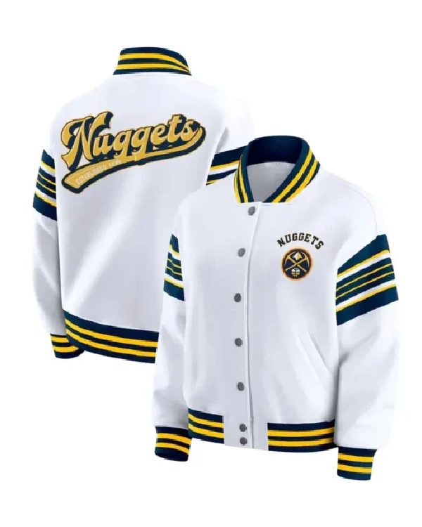 Buy Erin Andrews Denver Nuggets White Fleece Varsity Jacket for Men and Women