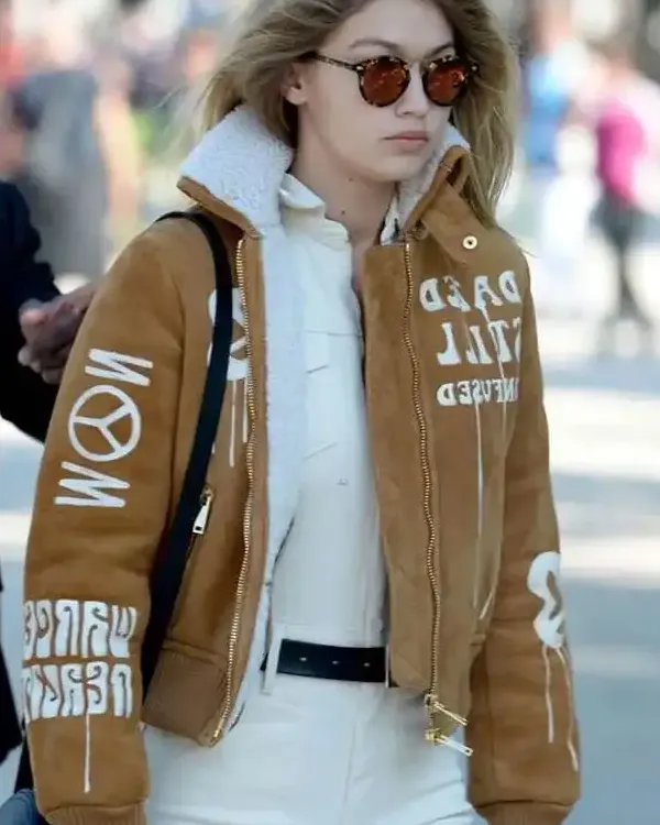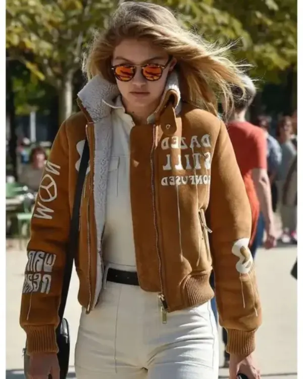 Gigi Hadid Shearling Brown Suede Leather Bomber Jacket For Sale