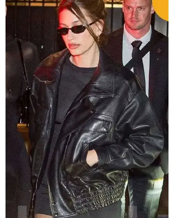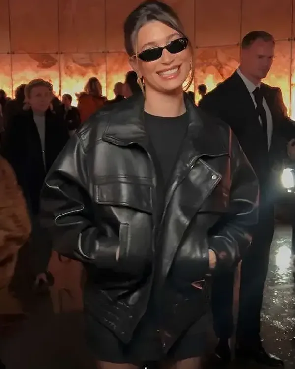 Hailey Bieber PFW 2025 Black Leather Jacket