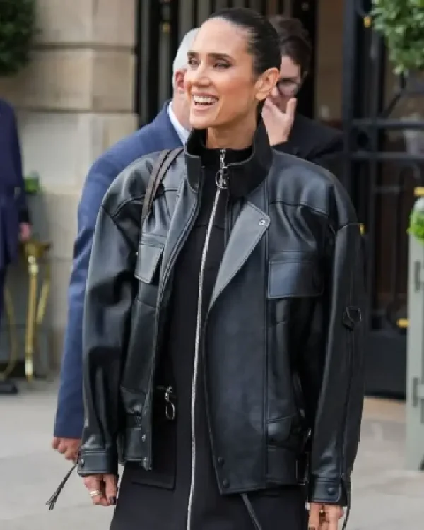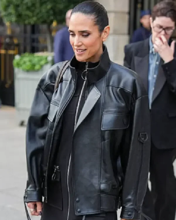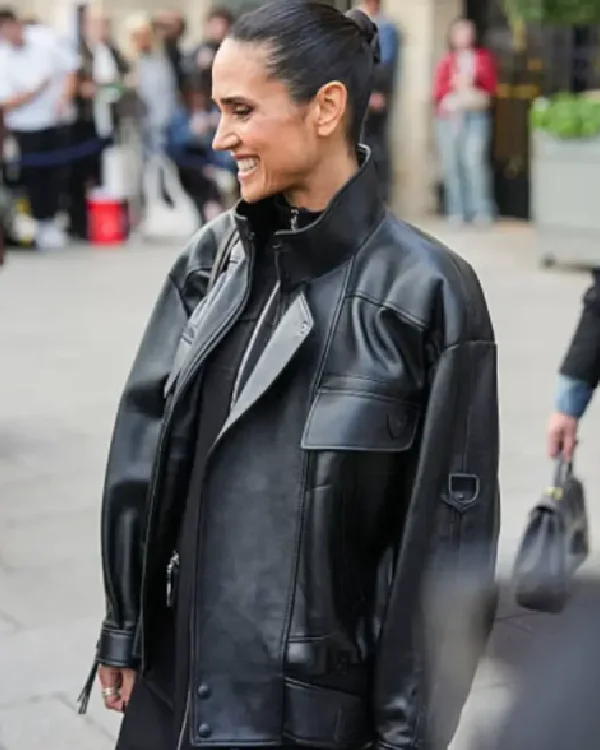 Jennifer Connelly PFW 2025 Black Leather Jacket