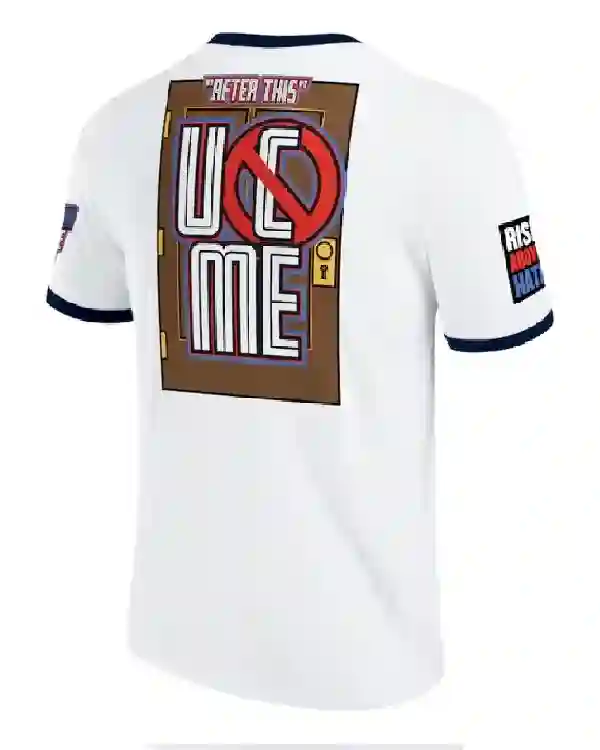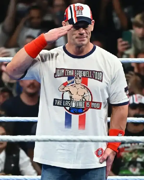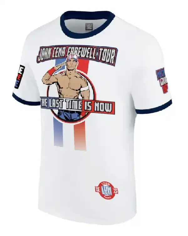 John Cena Farewell Tour 2025 Navy Trim, Saluting Illustration, Red & Blue Sleeve Slogan Prints Lyon White Ringer T-Shirt
