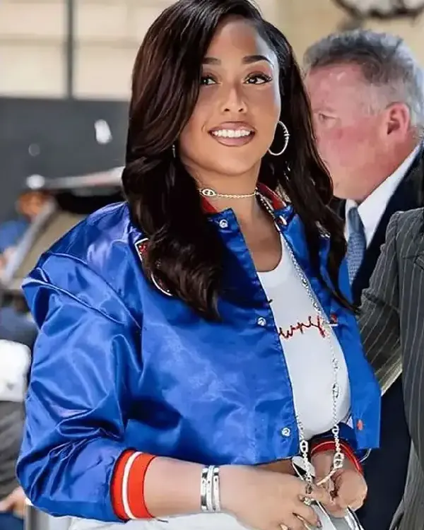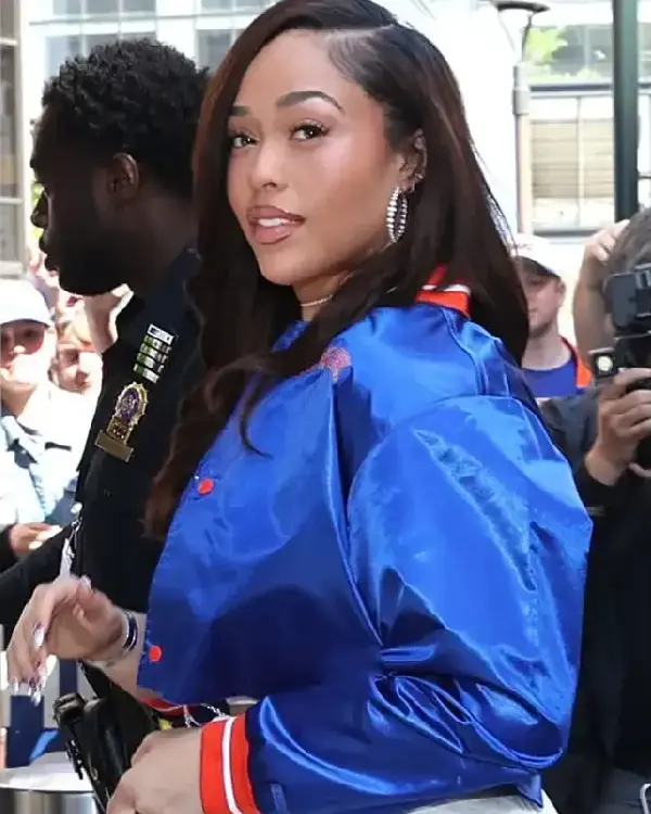 Shop New York Knicks Jordyn Woods Blue Cropped Satin Varsity Jacket Sale