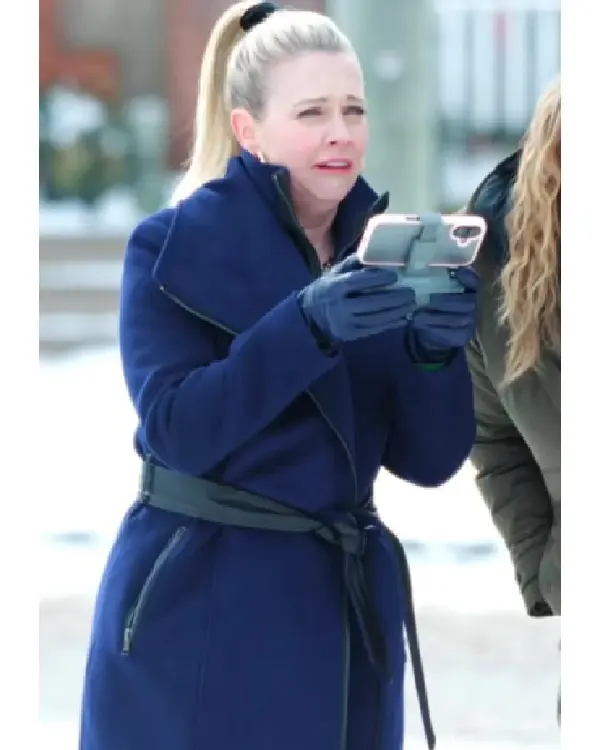April A Merry Little Ex-Mas 2025 Melissa Joan Hart Blue Wool Leather-Trim Belted Coat