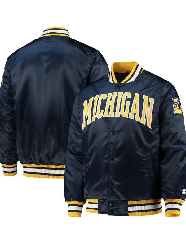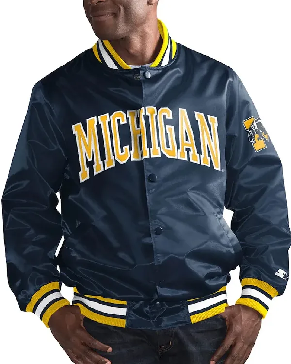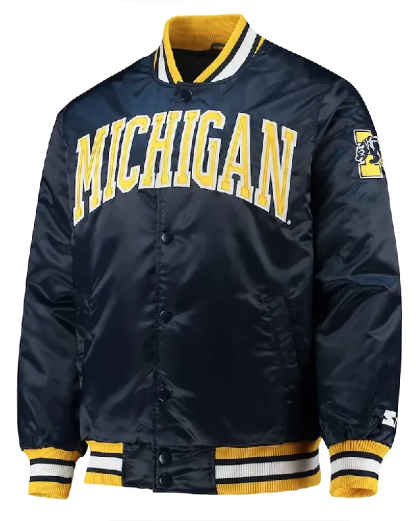 Shop Starter Navy O-Line Michigan Wolverines Varsity Satin Full-Snap Jacket Sale