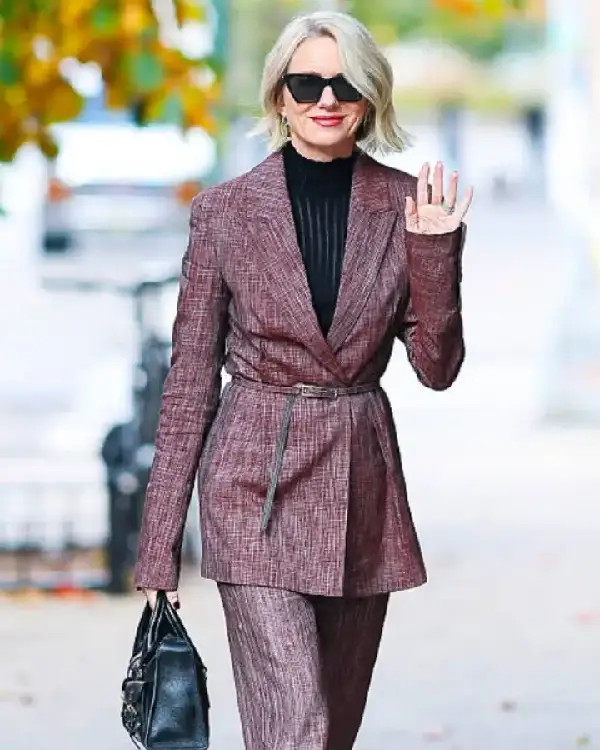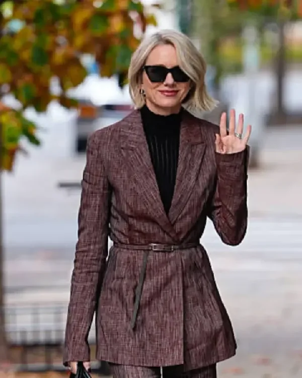 Buy Naomi Watts Tribeca NYC 2025 Double-Breasted, Peak Lapels Longline Burgundy Textured Blazer Sale