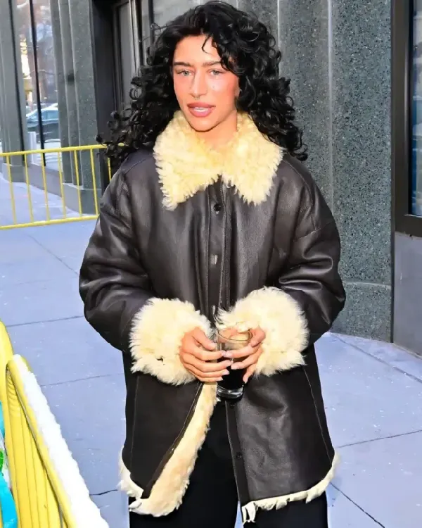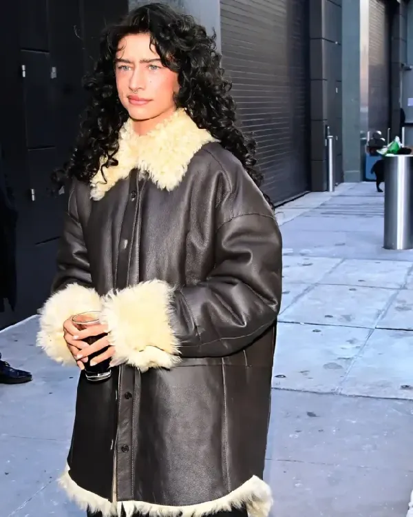 Buy Odessa A’zion ABC Studio 2025 Cream Brown Leather Aviator Coat