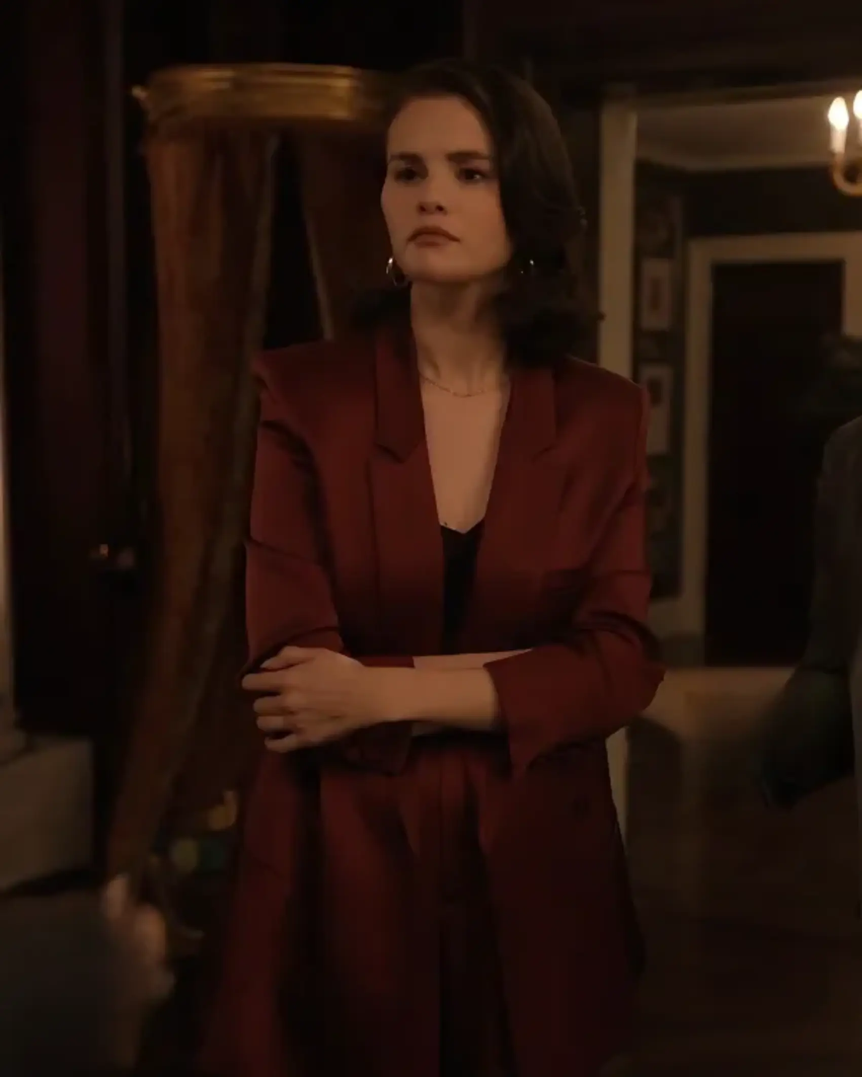 Buy Only Murders in the Building S05 Selena Gomez Burgundy Blazer Deep Red Satin Finish with Wide Notched Lapels & Structured Shoulder Pads Sale