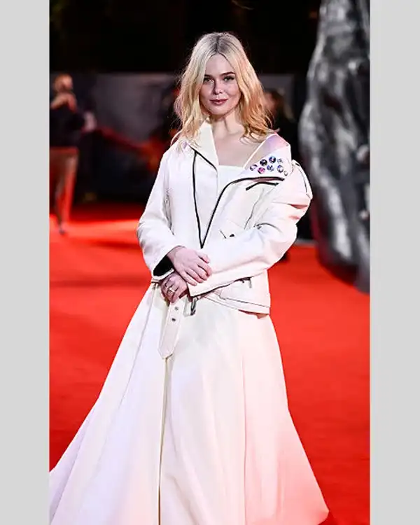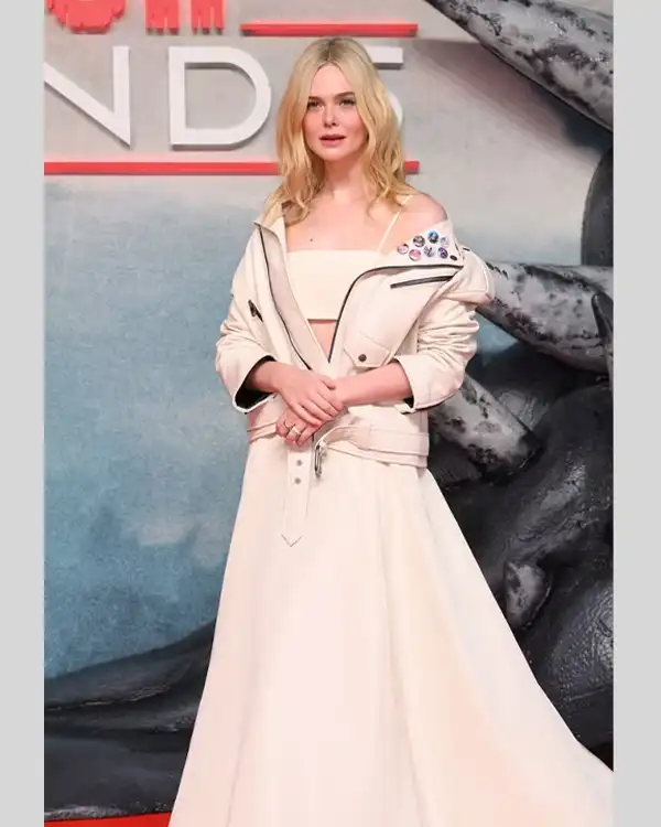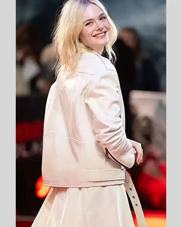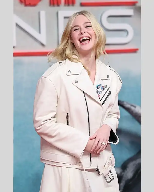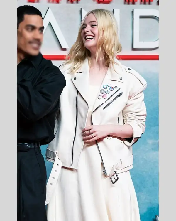 Shop Re-Creation – Elle Fanning Predator Badlands Event 2025 Thia White Leather Jacket Sale