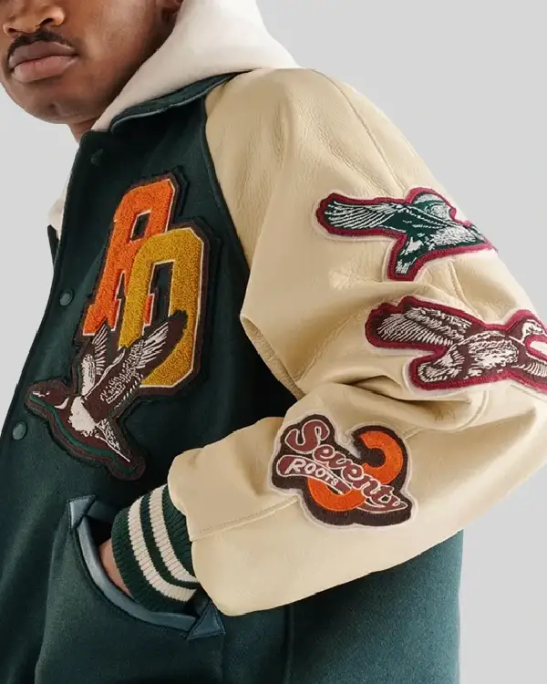 Shop Roots Outdoor 24 Green Varsity Bomber Jacket Green and OFF White Jacket Sale