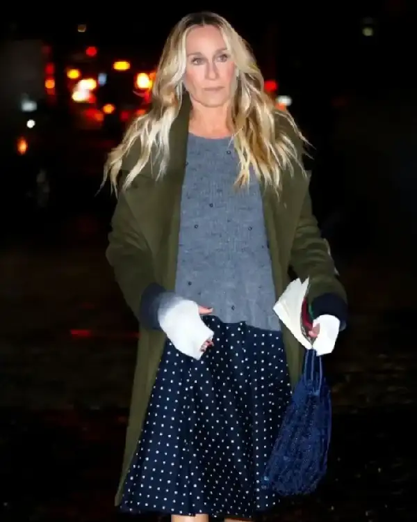 Sarah Jessica Parker NYC Open-Front Design, Wide Notch Lapels Military Green Wool Long Coat