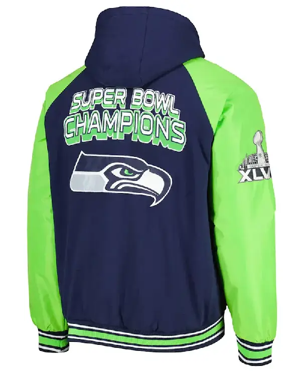 Home / Products / NFL / Seattle Seahawks Jackets / Seattle Seahawks College Defender Navy Hooded Varsity Jacket