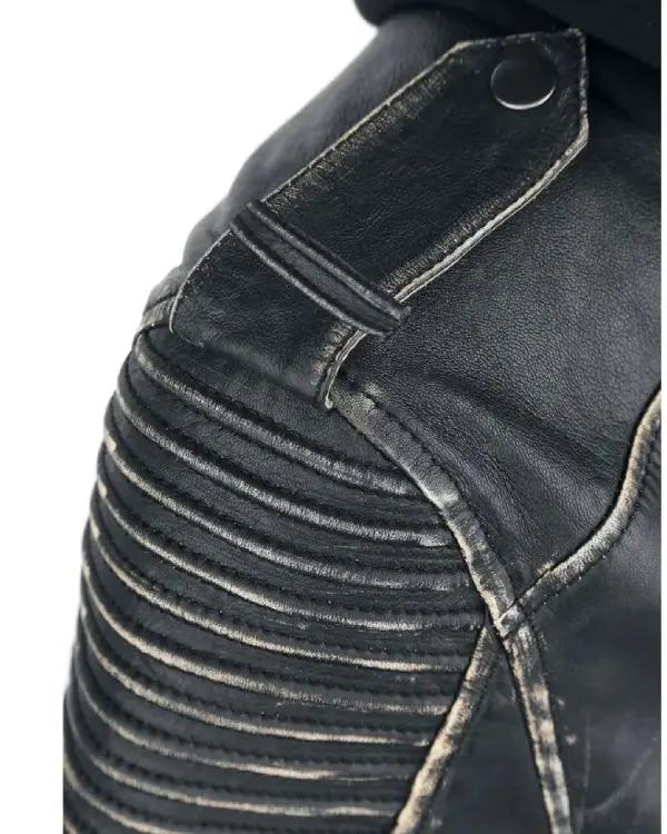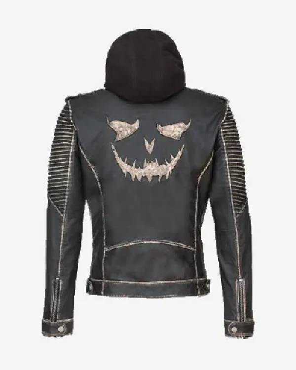 Buy The Killing Suicide Squad Joker Distressed Black Leather Biker Hooded Jacket with Graphic Back Design Sale