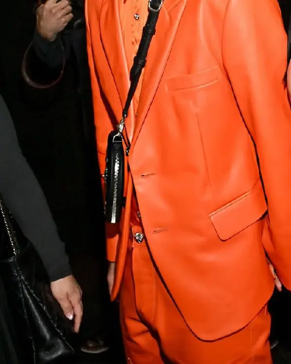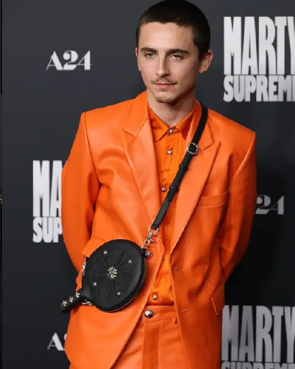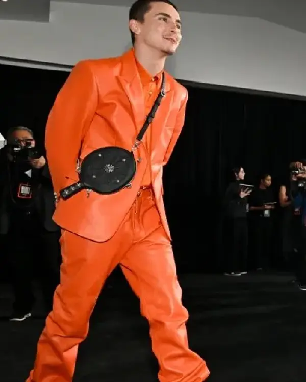 Shop Timothée Chalamet Marty Supreme Premiere Orange Leather Suit Sale