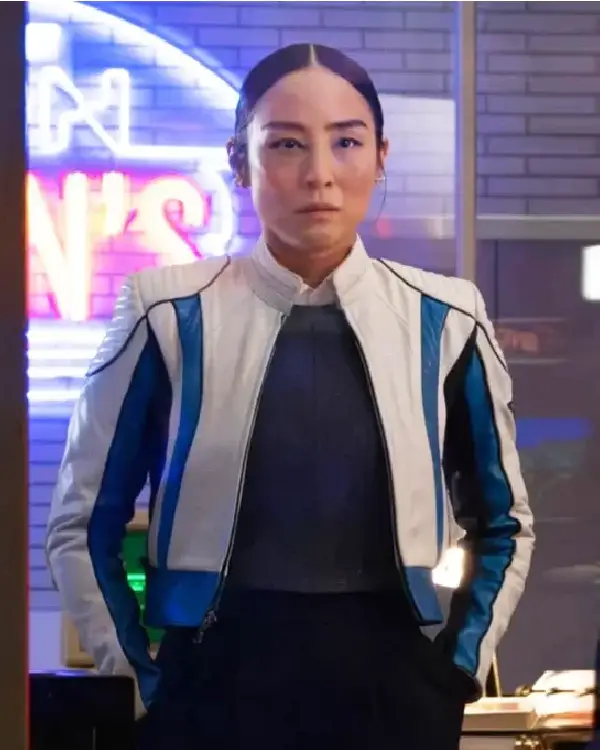 Greta Lee Movie Tron Ares 2025 Eve Kim Motorcycle White Leather Jacket