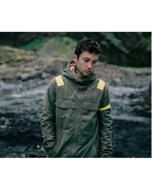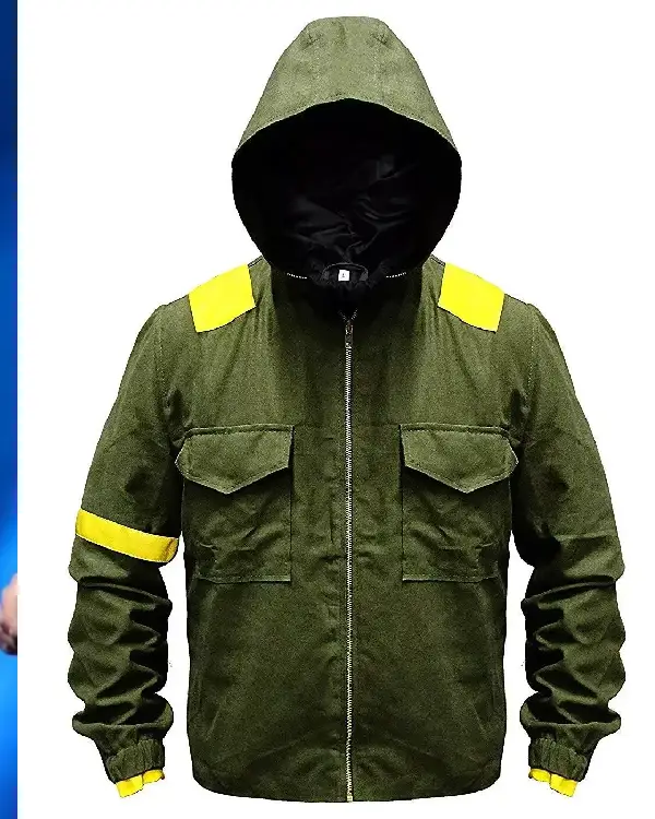 - Front: Full Zip Closure | Adjustable Hoodie | Yellow Straps at Shoulders and Sleeve