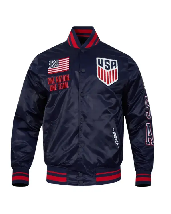 Buy One Team One Nation US Soccer 2025 Blue Satin Varsity Bomber Jacket For Sale